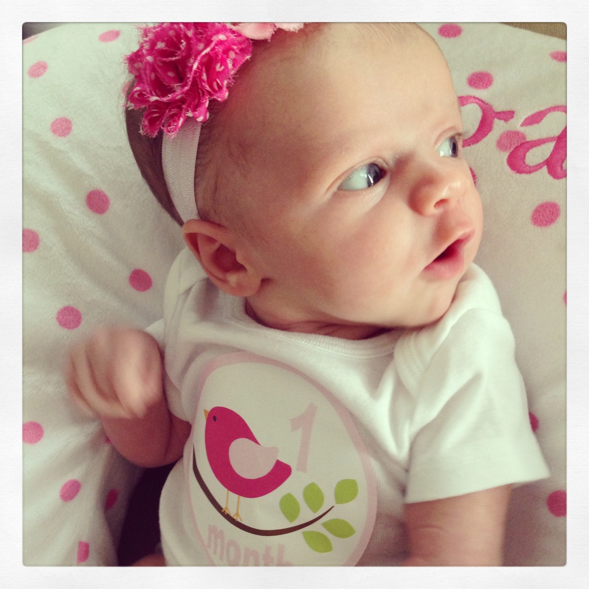 **This is one of the best shots I could get of her in her "one month" onesie...she was more interested in what was going on outside the window than the camera, lol.
